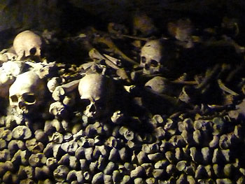 Parisians were immediately curious about their Catacombs, but the first public visits only took place in 1806. In that year Emperor Napoleon visited them, and the same year air-borne (!) photography pioneer Felix Nadar 'took the plunge'. Here he is underground. ![]() And today? Yes, for a modest fee you can visit the Paris Catacombs which are now managed by the city's Museums organization. Opening times: every day (except Mondays and holidays) from 10 AM to 5 PM. – last entry at 4 PM. The visit begins with a rather dizzying descent of a narrow spiral stairway's 130 steps. You then embark on about two kilometers of bone- and skull-lined galleries accompanied by the remains of some six million Parisians.